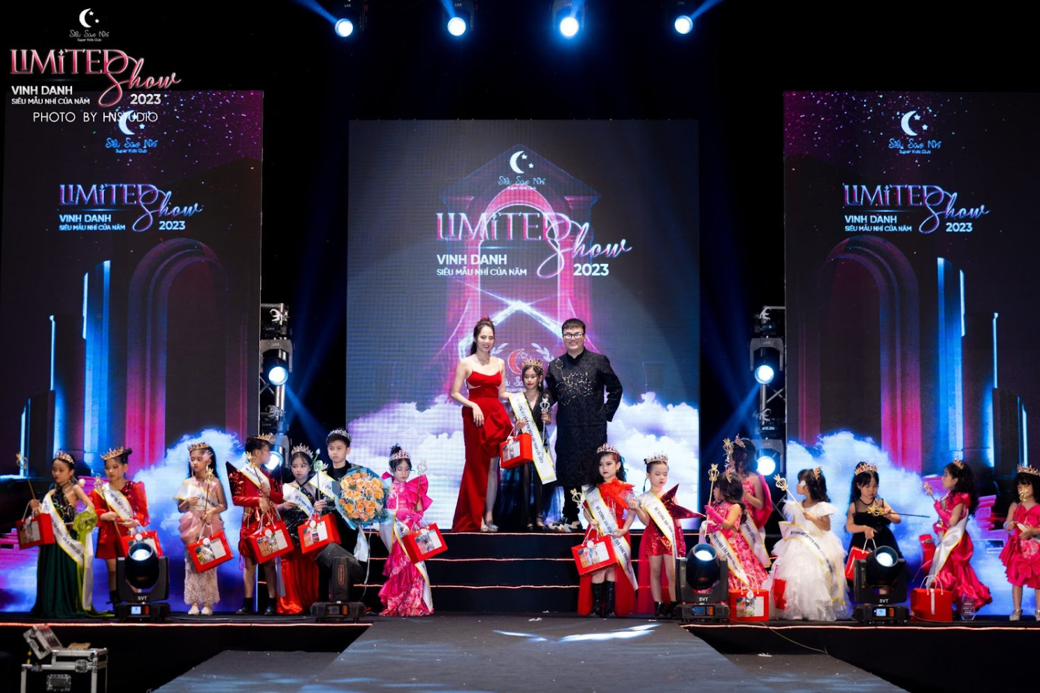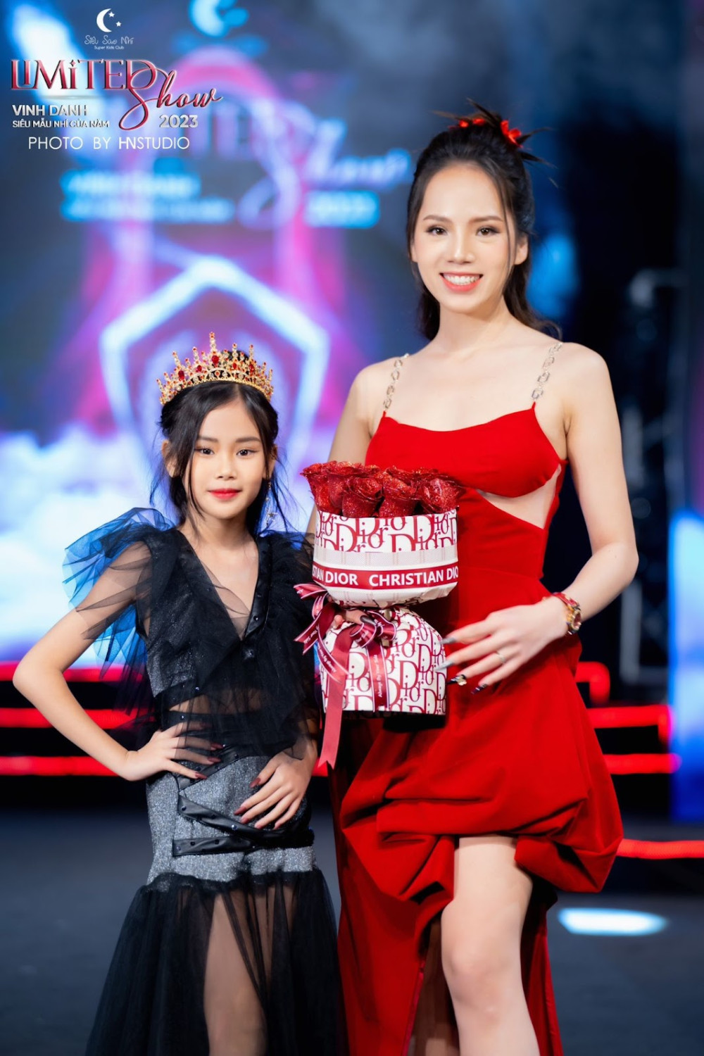 Lê Huyền Thiên Thư bên cạnh cô Huyền Thu (chủ nhiệm CLB Siêu Sao Nhí) và NTK Phạm Gia Hưng, chủ nhân của BST “Xúng Xính” trong Limited Show #2 2023