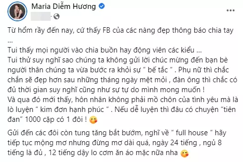 Gửi đến các đôi còn tung tăng bắt bướm, nghĩ về 'full house' hãy tiếp tục mộng mơ nhưng đừng mơ dài quá, ngày 24 tiếng, ngủ 8 tiếng là đủ, 12 tiếng dậy lo cơm ăn áo mặc nữa nha", Diễm Hương chia sẻ.